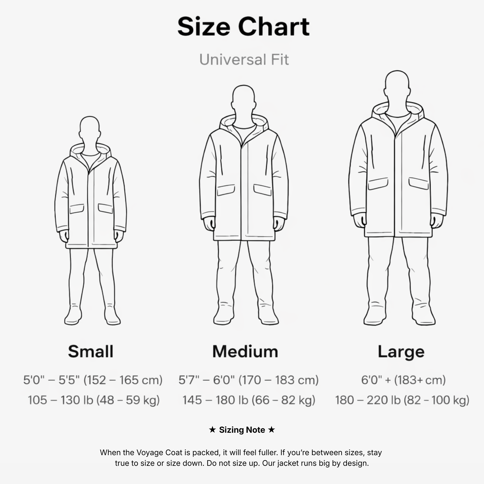 The VoyageCoat is designed as a roomy parka with extra space for comfort and built-in carrying capacity. When packed, the coat will feel slightly fuller. The fit is intentionally relaxed.