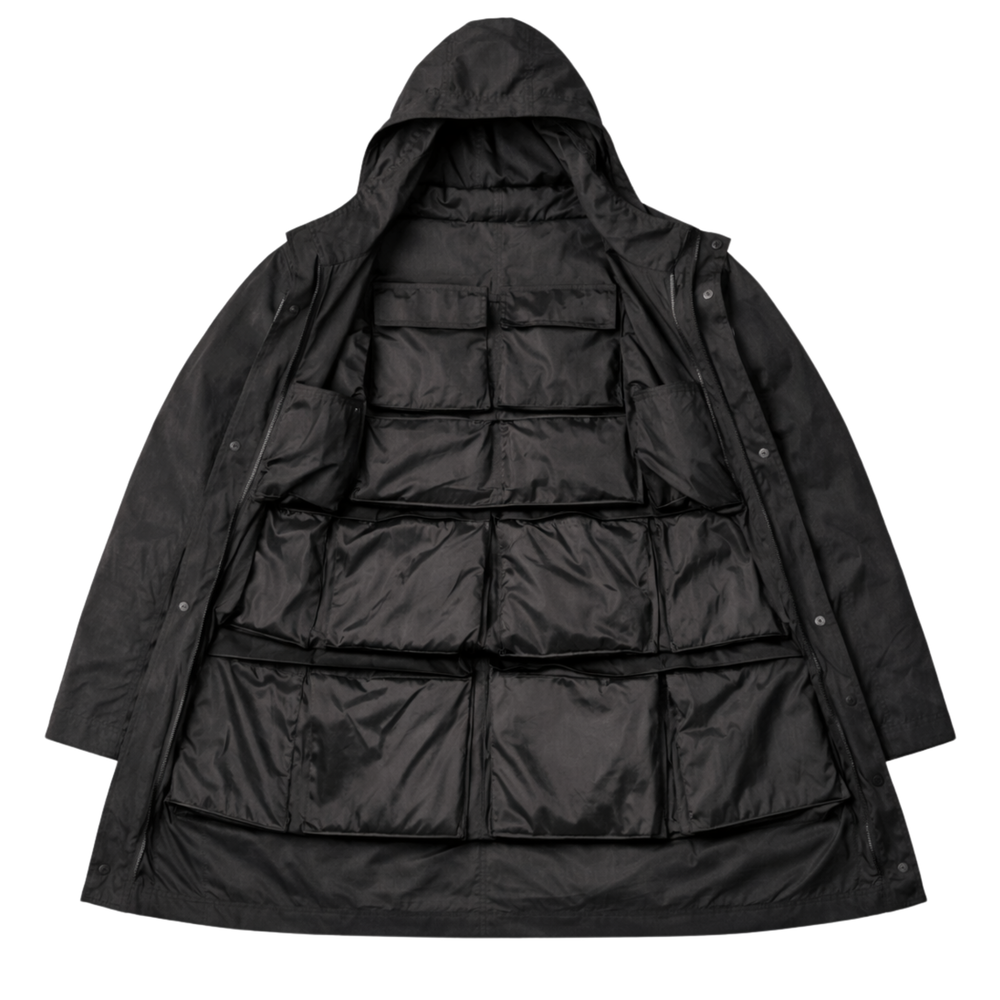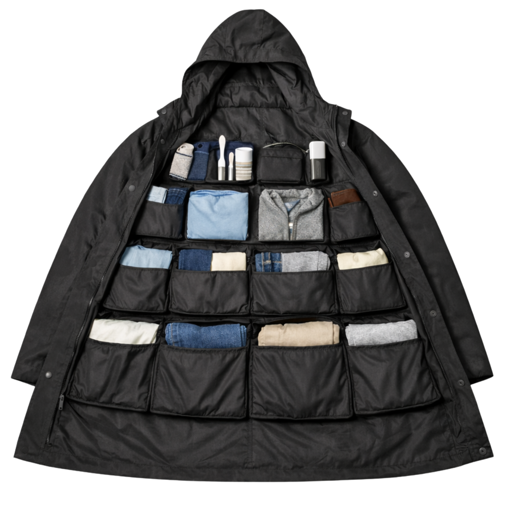 The VoyageCoat uses a custom internal layout that lets you carry clothes while wearing it, then fold everything into a duffel when you want to carry it.